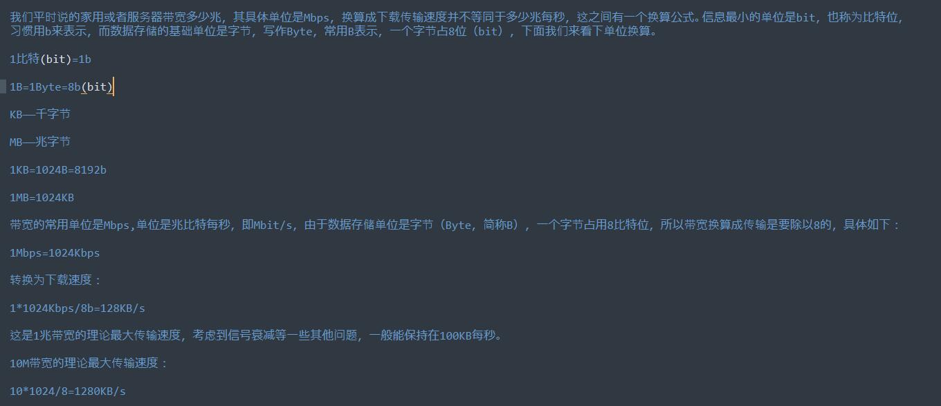 带宽的常用单位是Mbps,单位是兆比特每秒,即Mbit/s,由于数据存储单位是字节(Byte,简称B),一个字节占用8比特位,所以带宽换算成传输是要除以8的,具体如下: